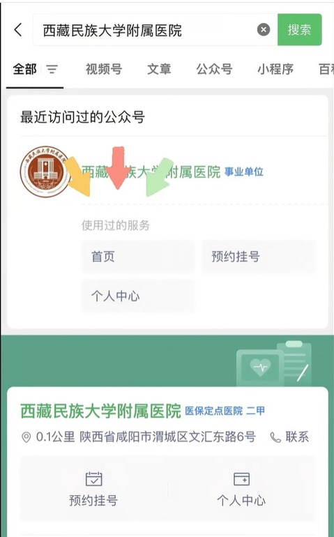 打开微信,在顶部搜索栏里输入“西藏民族大学附属医院”,找到咱们医院的官方公众号点击进行关注,然后进入公众号页面就行啦。