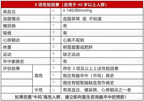 “8” 指8个主要危险因素:高血压、糖尿病、血脂异常、房颤、吸烟、明显超重或肥胖、缺乏运动、卒中家族史。