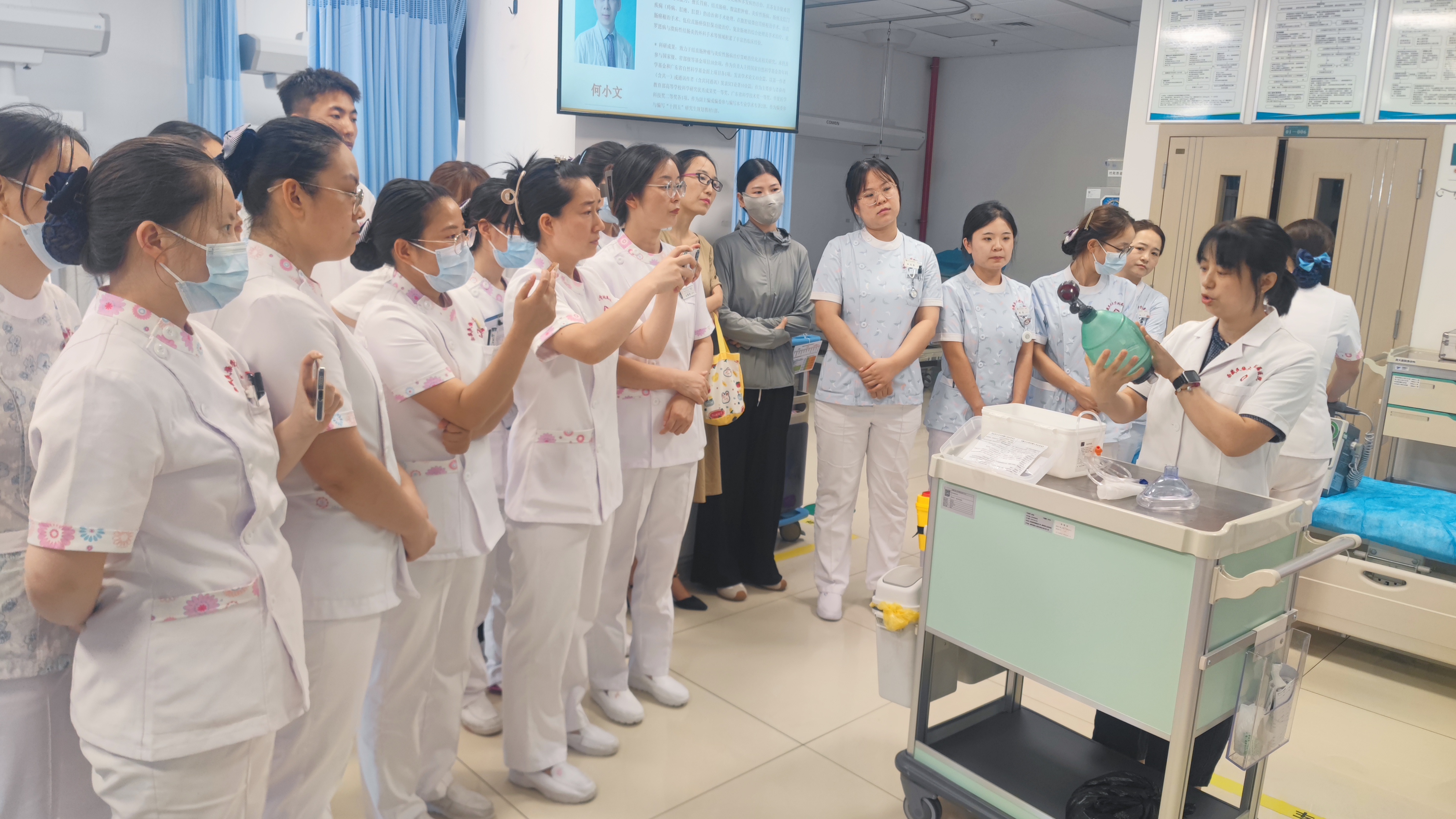 呼吸支持培训则聚焦呼吸机参数设置、管路连接与通气监测,并通过模拟操作掌握气囊使用要领。为强化知识迁移与场景应用,演练中有机融入前期授课内容,环环相扣,有效提升了团队协作与实战应对水平,真正实现“学中做、做中学”的深度融合,让急救技能从“纸上谈兵”变为“实战本能”。