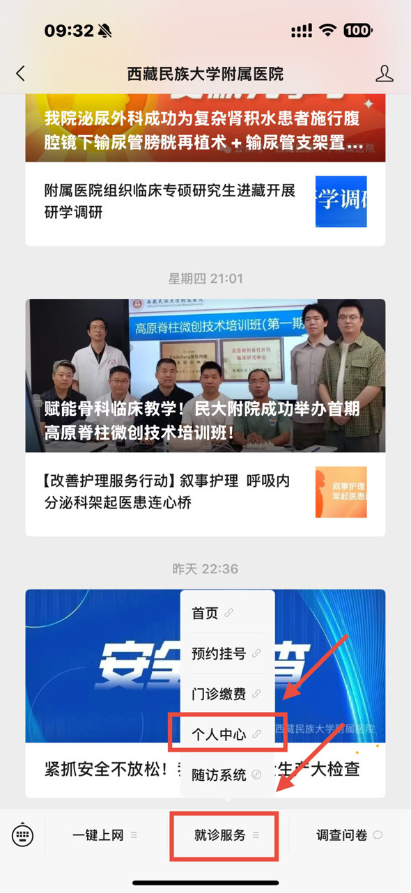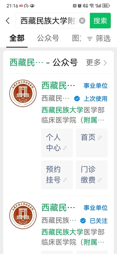 1.关注“西藏民族大学附属医院”微信公众运营号(图中第一个)