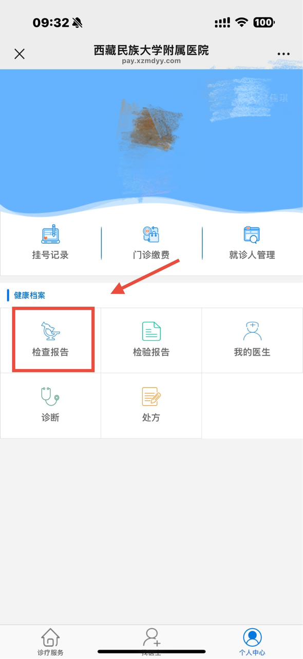 2.点击公众号页面最下方【就诊服务】专栏,随后点击【个人中心】-【检查报告】(如下图所示)