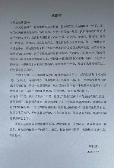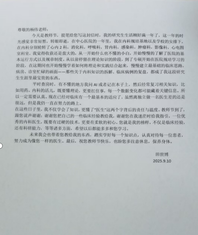 信中满是真挚情感。有学生回忆:“初入临床时,导师从病史采集教起,示范体检时放慢动作,让我在他身上反复练习至规范。”导师的耐心让学生逐步建立临床思维。也有学生感激导师指引:“从理论到临床的跨越,是导师带我拆解知识、复盘病例,让我懂得‘医生’的责任与温度。”还有学生称,虽与导师接触有限,但“导师对医学的热爱与智慧,是成长路上的充电宝”。