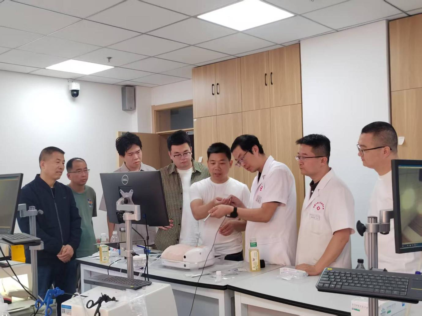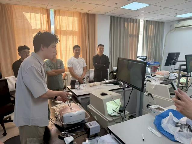 本次培训打破传统单向授课模式,突出“以练促学”,建立“专家示范—全员轮训—即时反馈”的闭环教学体系。张良明教授率先在模拟系统上进行操作演示,结合高原常见病例,系统讲解技术要点、器械使用规范及风险防控策略,通过“边做边讲、边问边答”的方式,将复杂技术直观化、具象化。