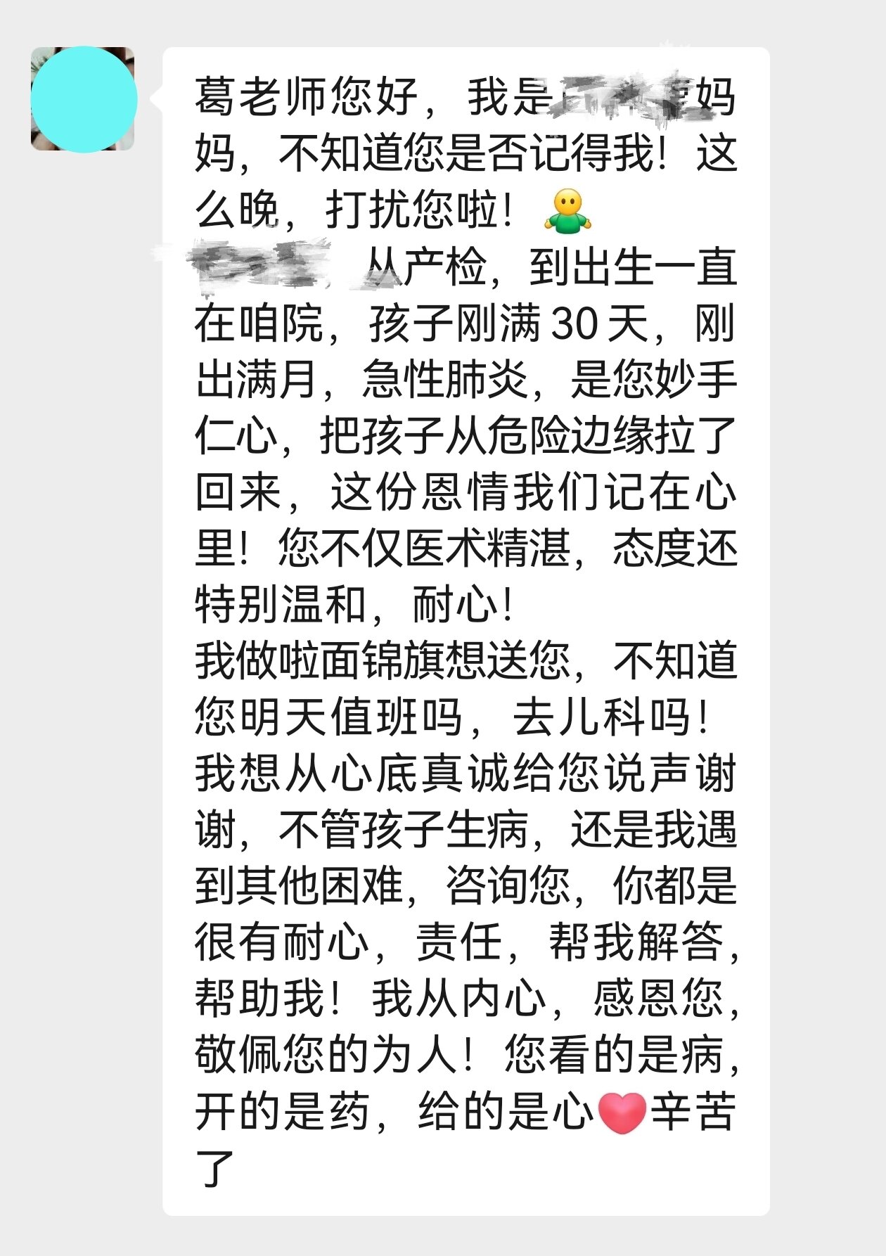 “您看的是病,开的是药,给的是心。”这是小安妈妈在微信中写下的肺腑之言。对她而言,锦旗不仅是为了感谢那次危急时刻的救命之恩,更是对五年来这份始终如一的守护与陪伴的深情回馈。在她眼中,葛主任不仅是医生,更像是孩子健康成长路上的一位可靠伙伴。无论是疾病诊疗建议,还是育儿过程中的焦虑与不安,葛主任总是以高度的责任心和同理心给予支持,用专业与温情筑起一个家庭安心的港湾。