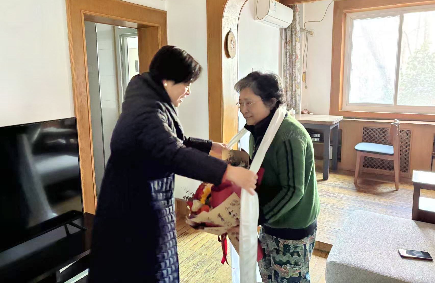 慰问过程中,院领导为老同志献上洁白的哈达和鲜花,致以崇高敬意、诚挚感谢和美好节日祝福。宁鹏详细了解老同志的身体状况、日常起居、家庭生活等情况,向他们通报了医院2025年各项工作取得的显著成效,尤其是成功通过三级医院评审这一重大喜讯。